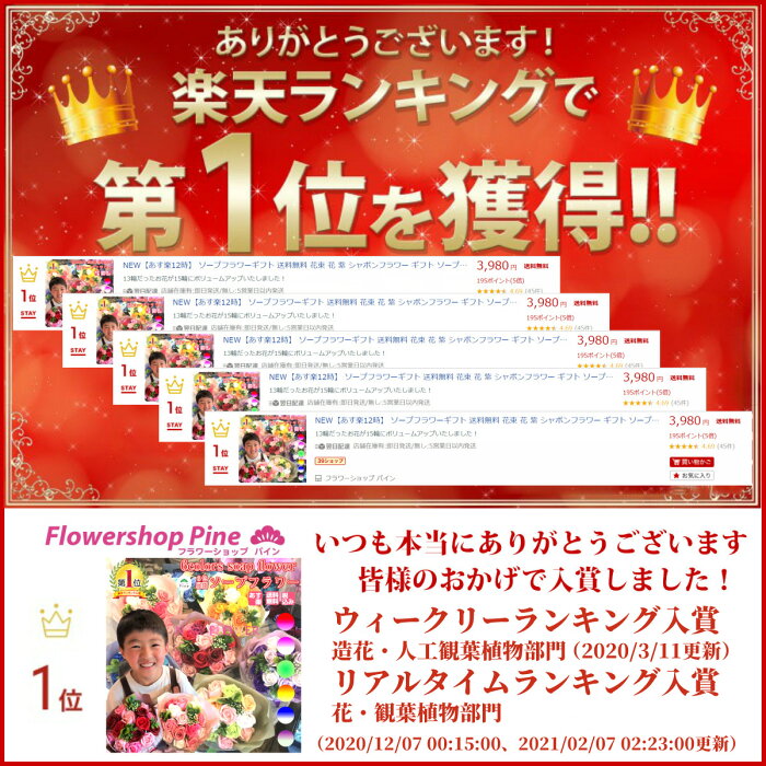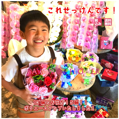 納期・送料については毎日、お問合せをいただいております、詳しくは店舗へお気軽にお問い合わせ下さい!対象キャンペーン開催期間:2020年9月1日(火)10:00 〜 2020年9月15日(火)09:59スーパーDEAL●快適おうち時間特集●開催期間:2021年3月4日(木)22:00 〜 22:59【楽天スーパーSALE】 目玉枠開催期間:2021年6月4日21:30〜21:59【楽天スーパーSALE】 目玉枠ソープ フラワー ブーケ ギフト バッグ入 [シャボンフラワー フラワーソープ ソープフラワーギフト ソープフラワー 花束 送料無料 メッセージ バラ] フラワーソープ 黄 結婚祝い 誕生日 フラワーソープ還暦祝い 宅配 花 フラワーショップ あす楽 ブーケトス お中元 15輪にボリュームアップ! フラワーショップパイン オリジナルフラワーソープブーケ 送料無料 ランキング入賞 ウィークリーランキング入賞花・ガーデン・DIY>花・観葉植物>造花・人工観葉植物部門 1位入賞(2020/3/11、2021/3/10更新)花・ガーデン・DIY>花・観葉植物>造花・人工観葉植物>ソープフラワー部門 1位入賞(2020/3/11〜...2021/3/10、6/9更新)デイリーランキング入賞花・ガーデン・DIY>花・観葉植物部門 1位入賞(2021/6/5更新)花・ガーデン・DIY>花・観葉植物>造花・人工観葉植物部門 1位入賞(2020/3/5〜...2021/6/5更新)花・ガーデン・DIY>花・観葉植物>造花・人工観葉植物>ソープフラワー部門 1位入賞(2020/3/5〜...2021/6/5更新)リアルタイムランキング入賞花・ガーデン・DIY部門 1位入賞(2021/03/04〜...2021/06/04 22:27:00〜22:52:00更新)花・ガーデン・DIY>花・観葉植物部門 1位入賞(2020/12/07〜...2021/06/04 22:10:00〜23:11:00更新)花・ガーデン・DIY>花・観葉植物>造花・人工観葉植物部門 1位入賞(2020/09/28〜...2021/06/04 22:10:00〜 23:11:00更新)花・ガーデン・DIY>花・観葉植物>造花・人工観葉植物>ソープフラワー部門 1位入賞(2020/07/29〜...2021/07/27更新) 枯れる心配がない! 生花にアレルギー体質がある方も楽しめる! 専用ギフトバッグ入り! お花は飾りたいけれど、すぐ枯れちゃうし・・・ お花を贈りたいけれど、アレルギー体質かも・・・ ブーケトスは思いっきり投げたい・・・ いらっしゃいませ!店長の松田です! 昨年、爆発的にヒットした「シャボンフラワー」「ソープフラワー」のブーケタイプです。